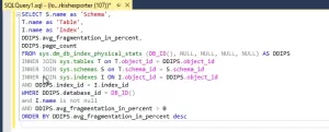 3.INNER JOIN İfadeleri: Bu ifadeler, verilerin birleştirilmesi için kullanılır. Sorguda, sys.tables, sys.schemas, ve sys.indexes tabloları ile sys.dm_db_index_physical_stats sonuçları birleştirilir. Bu, ilgili tablo, şema ve index bilgilerinin bir araya getirilmesini sağlar.