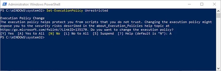 Set-ExecutionPolicy Unrestricted- `Set-ExecutionPolicy Unrestricted` sets the minimum security level that allows the execution of script files in PowerShell. This enables you to run almost any script file on your computer or any script that comes your way.