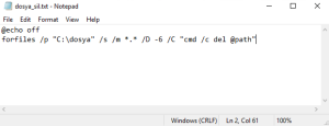 forfiles /p "D:\dosya" /s /m *.* /D -6 /C "cmd /c del @path"You can open a text editor, paste the code above, and save it with a desired name and .bat extension, such as file_cleanup.bat. Running this file will delete files older than the specified date in the designated folder. Caution is advised, as this operation irreversibly deletes files.