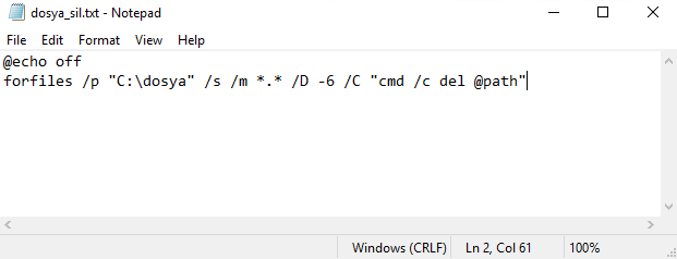 forfiles /p "C:\dosya" /s /m *.* /D -6 /C "cmd /c del @path"Here’s the breakdown of this command: