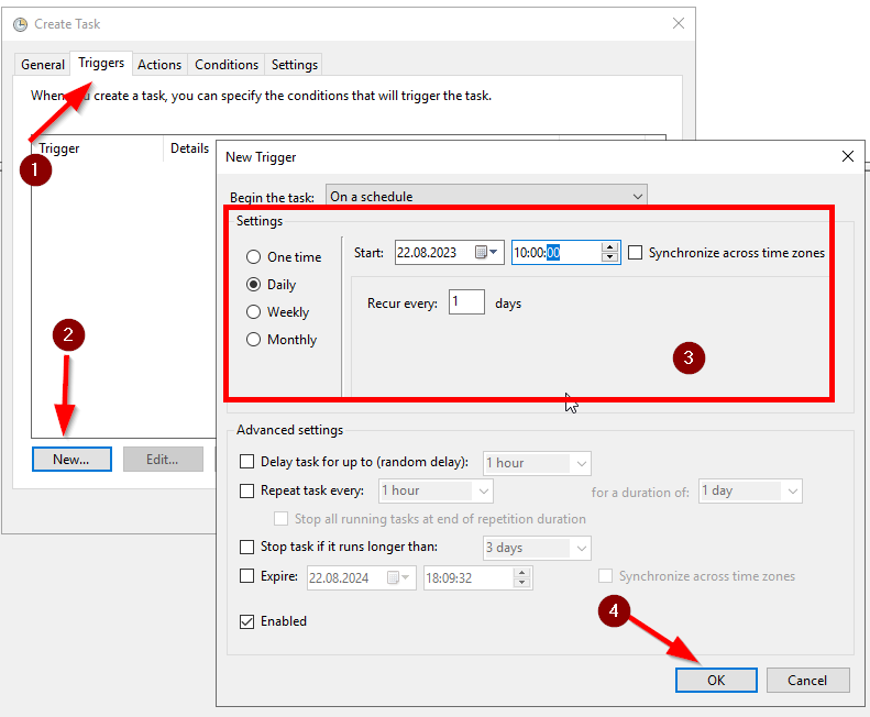The task will now run the .bat file automatically at the specified times. The flexibility of Task Scheduler allows you to easily customize when and how the file runs.
