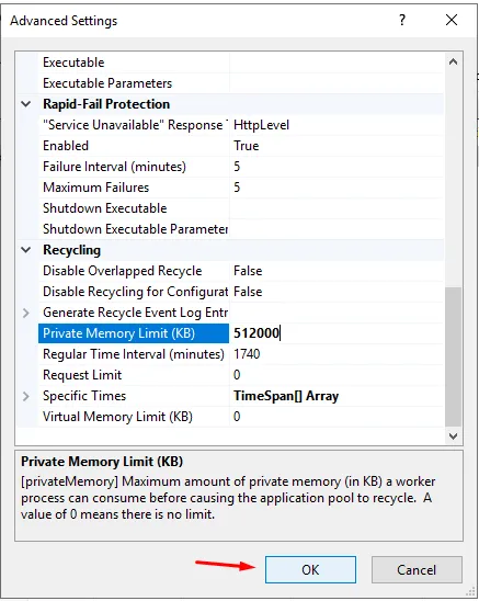 In the advanced settings window, you will see a field titled “Private Memory Limit (KB)” or “Private Memory Limit (Bytes)”. This field sets the maximum amount of private memory to be allocated to the application pool.